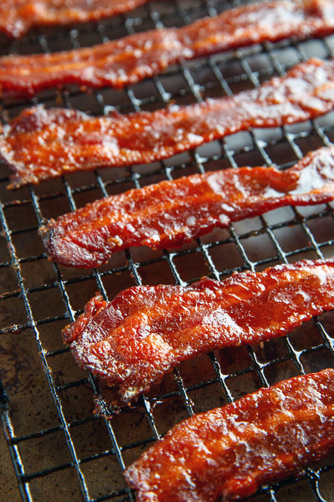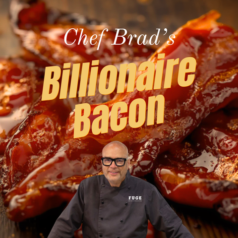 Billionaire Bacon starts with a whole pound of premium Irvings Farm Fresh bacon that gets lavishly coated with Chef Brad's secret blend of maple syrup and brown sugar.